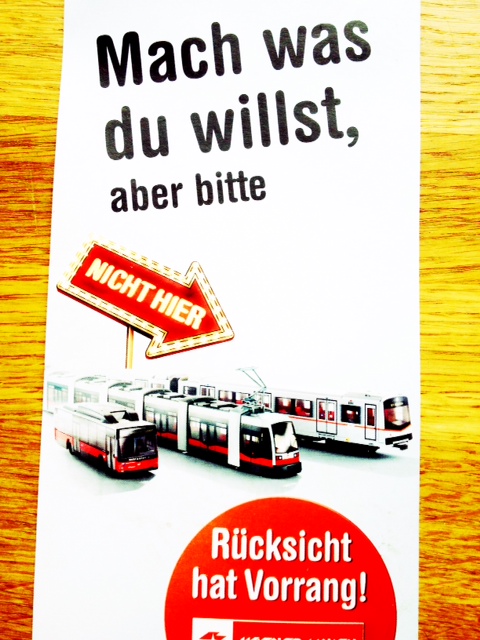 Actually, come to think of it the floor of my local bus was festooned recently with flyers proclaiming “Mach was du willst, aber bitte nicht hier”. Yes, I pondered, with not undisguised middle-aged consternation, what we need, I consternated, are some of those etiquette bouncers like the tripartite I saw last week, resplendent and cunning as they boarded the number 2 tram I was standing in, behaving impeccably. They were in pursuit of a young woman who had just entered clutching a magnificent cream cake. The woman, oblivious to all except the impending destiny of her sugary nibble, took an enormous bite and chomped happily whilst the three chaps from Vienna Transport clinically extracted their stun guns (joke). No, they watched impassively for a few seconds and then, with the diplomacy and charm that I sometimes love about Vienna, gently coaxed the cake back into the paper bag it had once called home and explained smiling and joking with the now red-faced and squirming woman, that maybe here was not the best place to stuff your face. And all it took was a nudge.