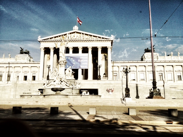 To garner inspiration I have parked my integrated and federal European rear in the vicinity of the neo-classical Austrian parliament building and the fortress of Vienna political and economic power, the town hall. One does not have to look far to encounter a political billboard or poster from the main parties, proclaiming the usual mix of straight talking emotion, subliminal modern marketing, effusive praise for Austria and specious fabrications (the Freedom Party before you ask).