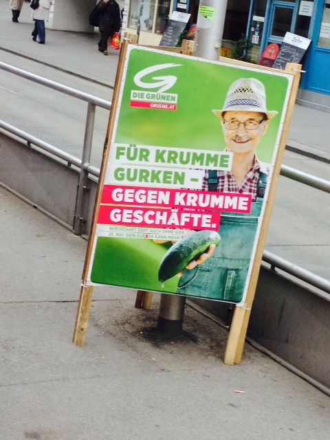 Such messages reveal very little that we didn’t know already. The Reds (SPÖ) and Blacks (ÖVP) are broadly in support of Europe, but not at the expense of Austria and their lobbyists. The Greens, sporting some suggestive imagery, seemingly support the EU and the people of the EU, articulated by the opinion that they would rather have wonky cucumbers than wonky business (including the despicable, rapacious lobbying industry). And the Blues (FPÖ) would prefer the EU left Austria alone with the customary scare-tactics about the accession of Turkey, too much money for bank bailouts and annoyance that the Dirndl is the subject of discrimination in higher diplomatic circles in Brussels. My personal favourite European election FPÖ poster asserts that they understand my fury. Really? So they must also be customers of UNIQUA insurance and the small business service team at Drei.