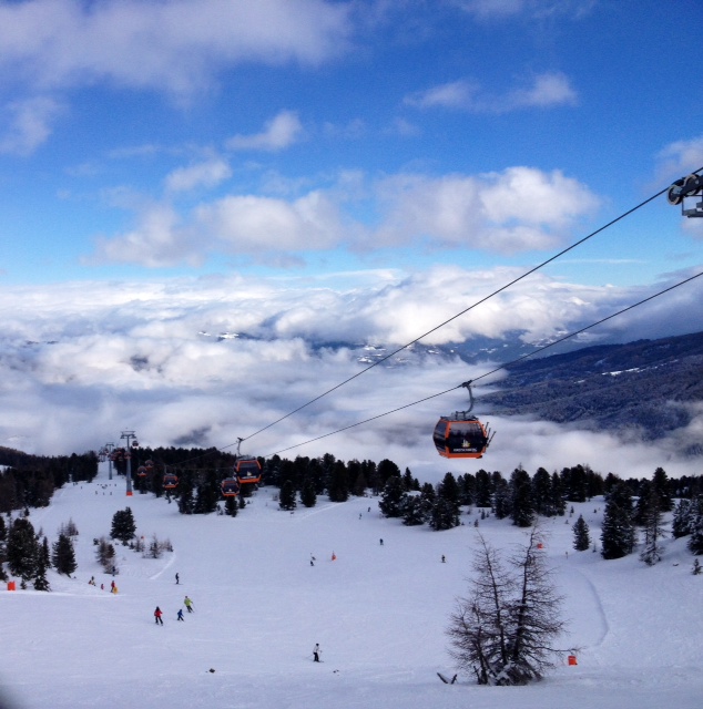 We stay at the foot of the Kreischberg gondola about a three hundred metre agonizing walk in rented ski boots or a decadent one minute drive if you have whinging offspring and value your early morning, fresh as a daisy demeanor. An Austrian gondola is exactly the same as a Venetian one except it doesn’t float, there is no stripey-shirted driver intent on propelling you around a lagoon for the price of an EU bailout and no one understands references to Cornettos. No, an Austrian gondola is a cable car. Inside you sit in silence, avoiding eye contact. It is like the London Underground swinging in the wind and if your knees touch another passenger, a helicopter will noiselessly appear and you will be surrounded by abseiling, masked men with sharp looking snow-stuff.