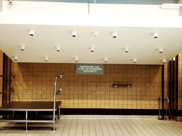 Once your ticket has been checked and processed, with a scrutiny which is quite charming in its own way, you are allowed to proceed to the pool itself and ascend to the next floor via twin staircases either side. Depending on your budget you either traipse off to the normal changing facilities or, if you like removing your clothes in a room not much bigger than a phonebox, you locate your individually assigned Kabine.